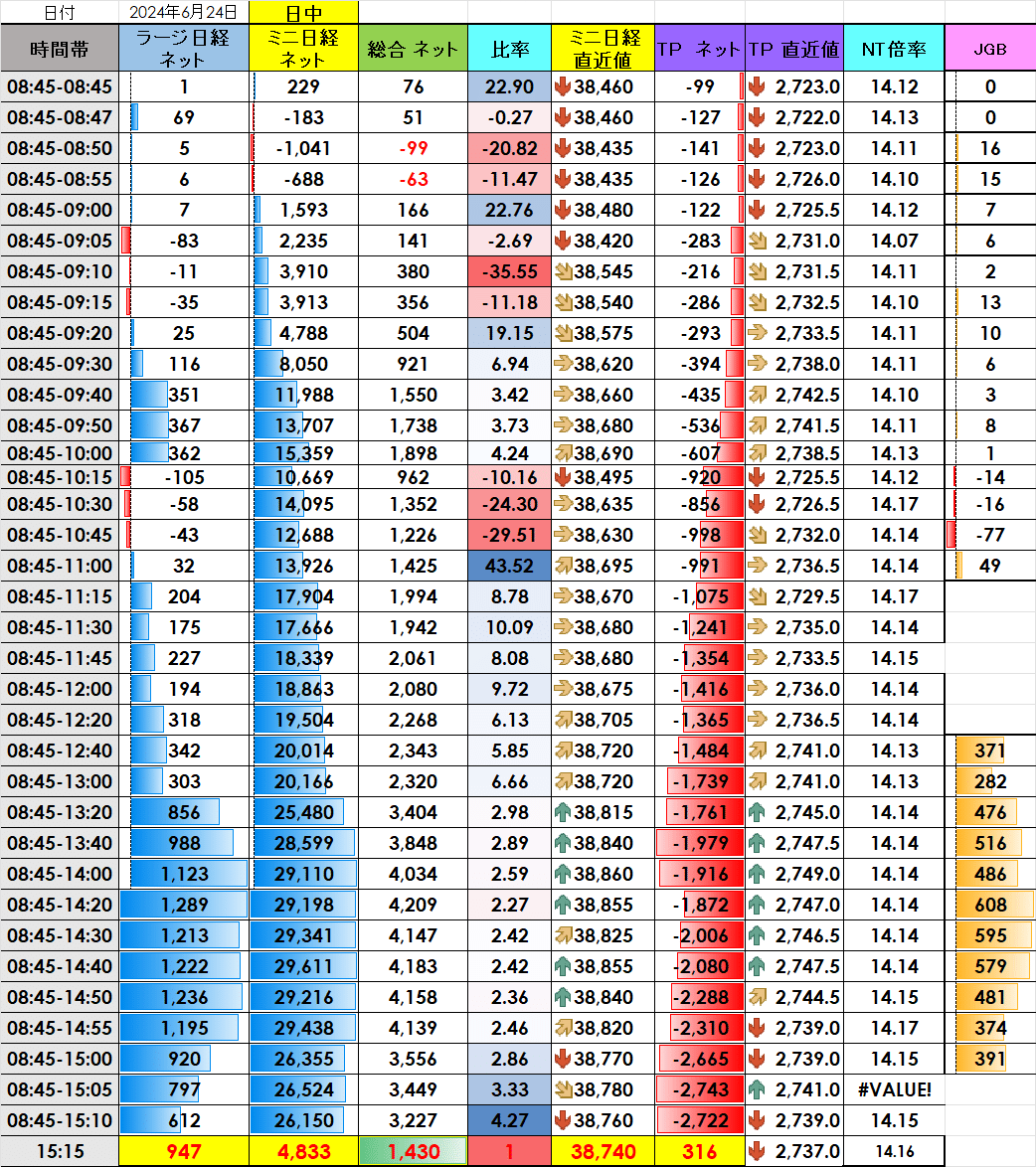日経先物 vs Topix先物 2024/06/24 NT買い 円安効果よりもNT買い 以下の表は、6月24日の先物売買動向表です。日経先物は、ミニ日経中心に大きく3万枚近くも買い越し。ただ、一方のTopix先物は、3千枚弱の売り越しで、まれに見る大きな売りの枚数でした。円安効果もあって日経が買われた要因もありますが、意外と今日の相場はNT買いだったのでは?楽観的モードは時期尚早かもしれません。 NK Radio 最新トレンド&トピックス
