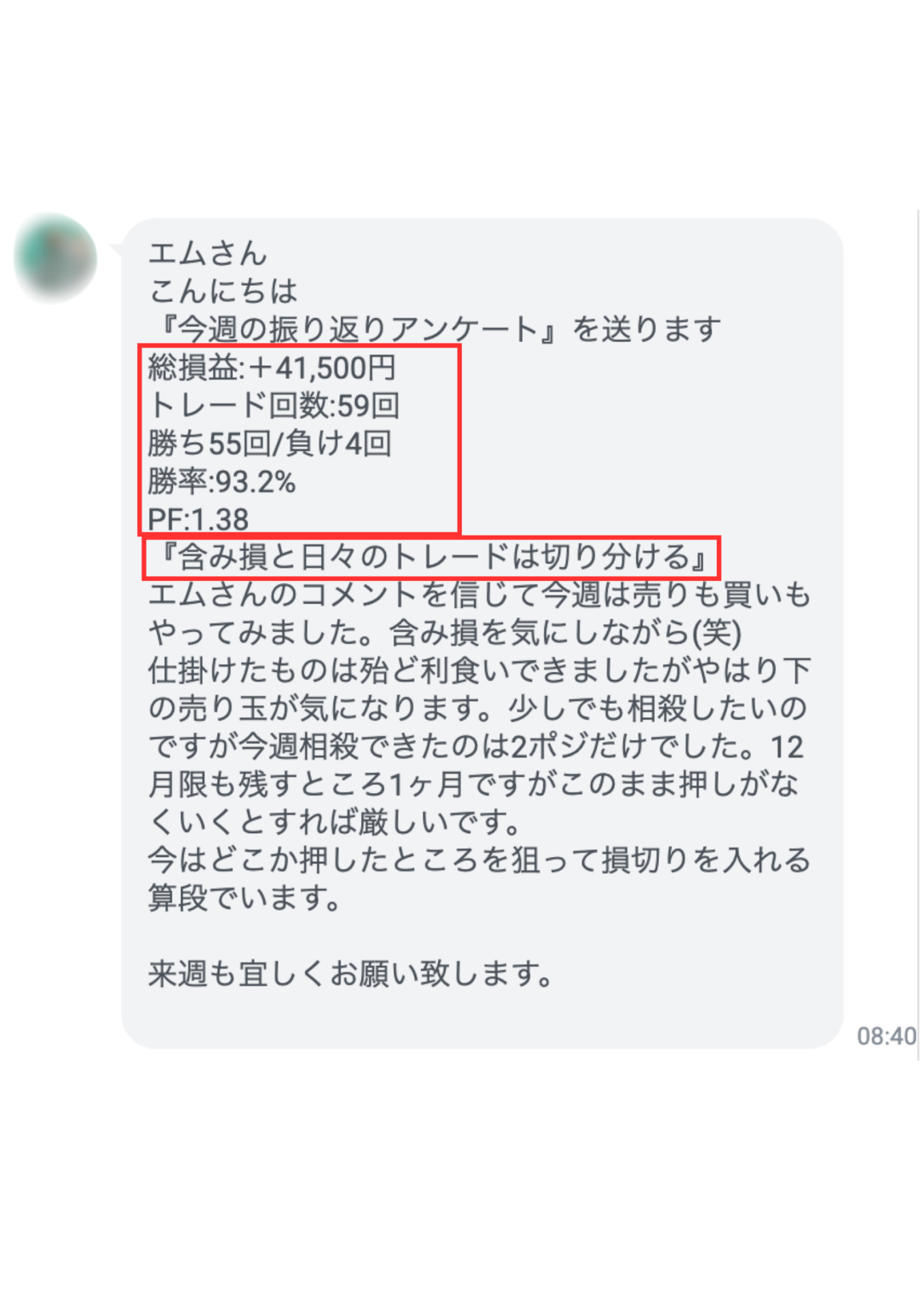 毎朝8:45に、講師「えむ」氏がポイント売買の発信をおこなっています。発信される上値と下値の目安と実際の相場状況と照らし合わせ、売買の判断が可能になります。